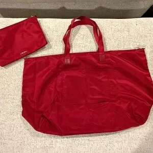 Tumi foldable nylon tote bag with luggage strap to slide on to your suitcase. New-never used. Approximately 14” X 23” X 9”