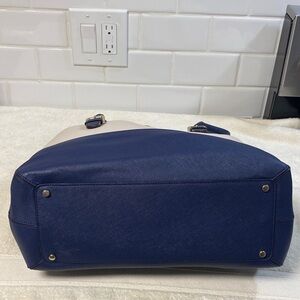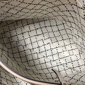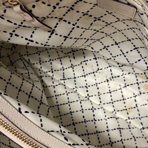 Kate Spade tote bag features an adjustable shoulder straps as well as having bottom feet for support. The bag is a main open closure that does have a inner middle zip pocket for convenience, as well as having an open pocket on either side of that.. Beautiful bag measures 16 inches across 11 inch height 5 inch width . The call out it does have a little bit of interior staining on one of the open pockets, as well as a little bit on the interior side wall above the pocket area this is shown in pictures