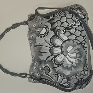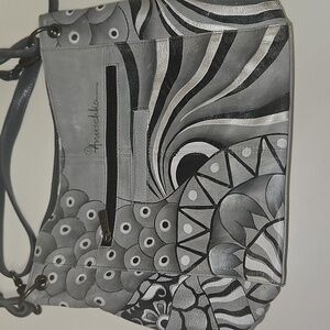 Anuschka handbag Black White Gray Front Double Zipper Pocket Back Zipp Pocket Interior Zipper Pocket Two Open Pockets and Key Clip Pre-owned Condition Shows Signs of Use But Overall Good Condition See Pictures