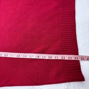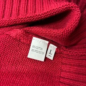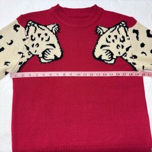 Stylish red sweater with bold leopard print design. Features cream and black accents.