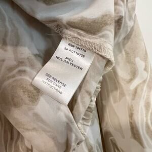 All orders ship within 1-3 business days. This tan and white blouse features long, flared sleeves and a wrap fit in the front. 100% polyester. Excellent condition. Size large. Make me an offer!
