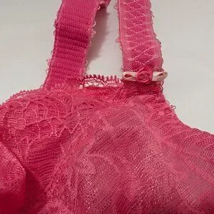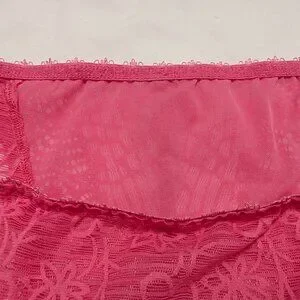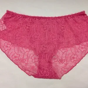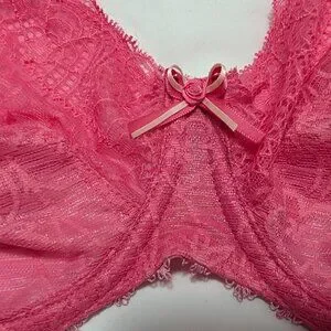 Pretty pink "Barbiecore" bra with cute bow and rose details on the center gore and straps. Floral lace unlined bra and panty matching set. Panty is model # AA4106BUU size M, kind of a hipster or shorty style.