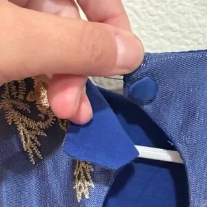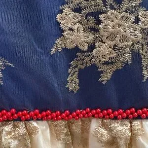 Charming dress with a blue bodice and gold floral embroidery. Features a red accent at the waist.