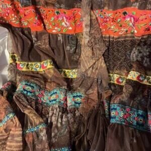Bohemian, boho, hippie, eclectic, multicolor, flowy, festival, indie Western Southwestern country ethereal flowy soft feminine sheer natural chocolate brown chiffon tiered sheer panel dark floral loral, embroidered, victorian, Edwardian,
