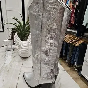 Shimmering metallic silver boots with a sleek design. Perfect for elevating your look. Worn once.