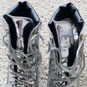 Metallic Patent Leather Chrome Silver lace up chunky high heel ankle boots Y2K