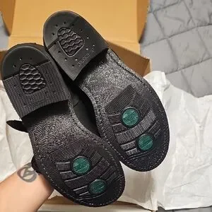 Classic black leather boots with sturdy design. Features stylish buckle detail.