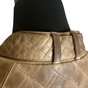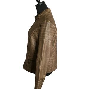 Edgy faux leather jacketfrom J2 features snap collar closure, zippered pockets and sleeves and quilting detail across chest and back. Coat is in very good preowned condition, marked XL but fits smaller. See measurements.