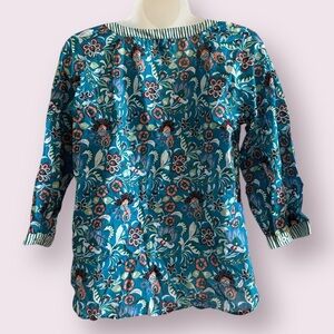 Talbots Jacobean Floral Popover Blouse - Blue Band Collar Half Sleeve, Size SP