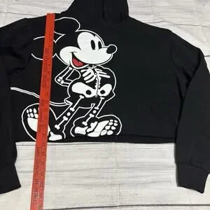Disney Mickey Mouse Skeleton Juniors Size Large Oversized Cropped Hoodie Glows In The Dark. Back of hoodie has a marking. Graphic shows wear. Please see all pictures for reference, condition and measurements.