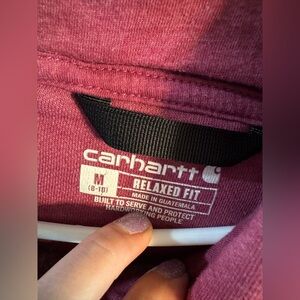 Cozy Carhartt hoodie in berry shade. Features front pocket and sleeve logo.