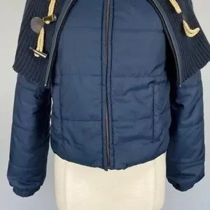 Stylish and unique Daughters of the Liberation jacket from Anthropologie, featuring a cozy padded puffer body with a dramatic ribbed knit cape overlay and signature rope-and-toggle closures. This modern-meets-vintage design adds a chic nautical twist to your fall and winter wardrobe. The cropped silhouette is both flattering and functional — perfect for layering over sweaters or long sleeves.