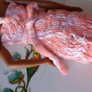 *The dolls are sewn into the clothes, but they can still sit and stand fine. The dresses are secured with clear elastic string.