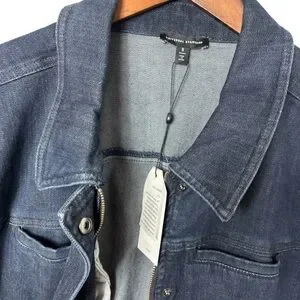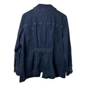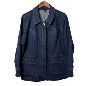 Classic dark blue denim jacket. Features front pockets and button closure. Ideal for layering.