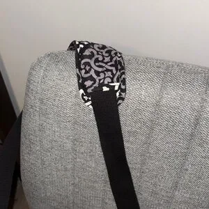 Stylish travel bag with intricate black and purple pattern. Perfect for any journey.