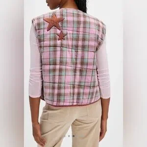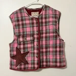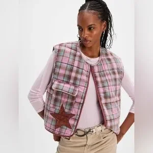 A charming addition to any outfit, this quilted, cropped vest from We The Free is featured in a flannel plaid fabrication with a flap pocket and corduroy star patches.
