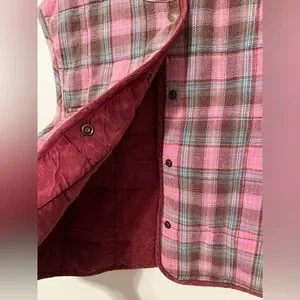Features: Flannel fabrication, collarless, plaid print, snap-front closure, flap pocket, contrast trim, corduroy star patches
