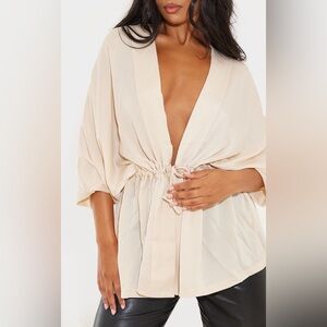 PLT Cream Textured Woven Plunge Tie Waist Blouse