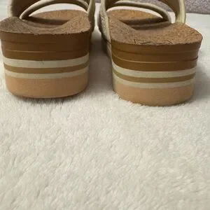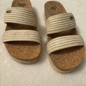 Reef sandals featuring cork platform. Cream straps add elegance.