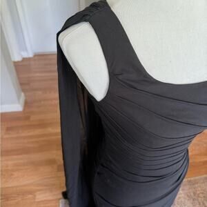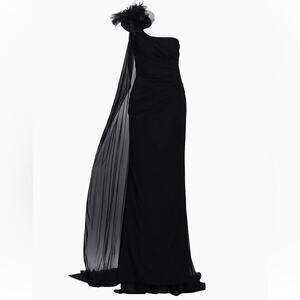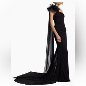 Crafted of luxe silk chiffon, this Pamella Roland gown flaunts gathered detailing at the bodice and a one-shoulder neckline. A long draped detail hangs from the floral embellishment at the shoulder.