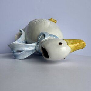 Fitz and Floyd White Goose Pitcher Blue Ribbon Handle Vintage Kitchenware
