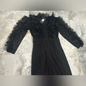 This Fashion Nova jumpsuit features a sleek black design with a fitted trousers silhouette, perfect for formal occasions. The combination of a sophisticated lace bodice and smooth, straight-leg trousers creates a chic and cohesive look. Ideal for evening events, this jumpsuit offers a blend of elegance and classic tailoring.