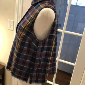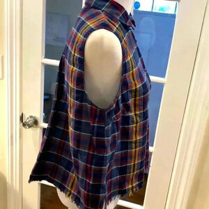 Madewell sleeveless button down shirt with frayed hem. Plaid is blue, gold, white, red. Size S
