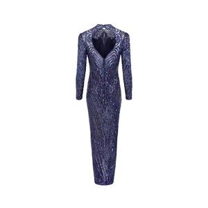 Bob Mackie long sheath dress and fully embellished in iridescent midnight blue sequins and bugle beads on black silk mesh. Circa early 1990s, the neckline is high and the collar and bodice is extremely detailed with a mesh panel giving the illusion of a deep plunge.