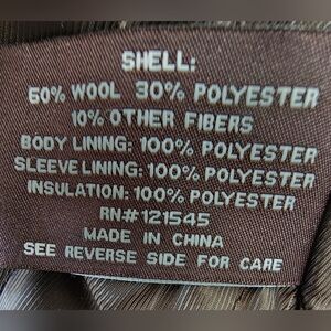Shell - 60% Wool, 30% Polyester and 10% Other fibers.
