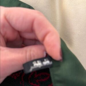Stylish Hermes scarf with vibrant red and white pattern. Adds a chic touch to any ensemble.