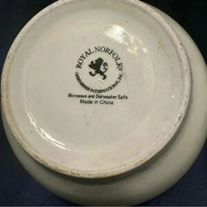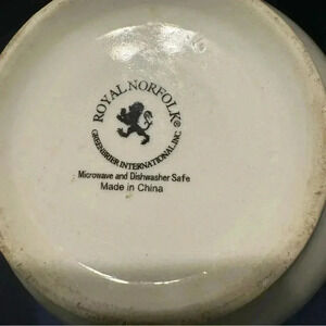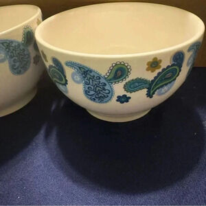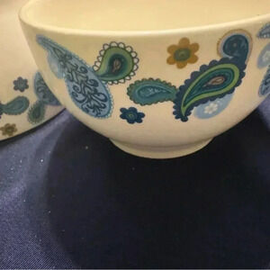 This is two pre-owned cereal / soup stoneware bowls from Royal Norfolk. It has a pretty blue and green paisley pattern, measures 5.5" diameter, and stands. Thanks for looking!