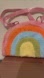 Vibrant faux fur handbag with a rainbow design. Features pink, orange, green, blue, and cream colors. Perfect for adding a pop of color to any outfit.