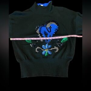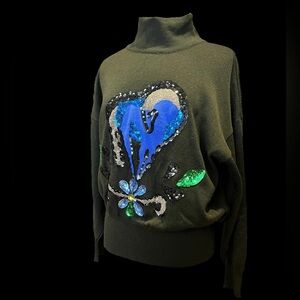 EUC on this beautiful designer sweater from Escada by Margaretha Ley. Done in a gorgeous hunter green and royal blue. A bit of a mock turtle neck with interior contrast of royal blue finished by a Banded waist. Sequins in blue, green and black accented by some metallic thread work. Made in Germany, euro size is 42. Fabric content is 95% wool, 3% Angora, 1% rayon and 1% metallic. Please see photos for measurements. Great statement sweater!! ❌not to be combined with any other closet offers❌