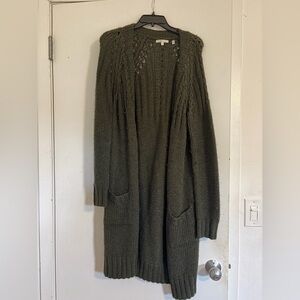 Top/ shoulders of the cardigan is a looser open knit, body of the cardigan is a tighter weave. button down front with two front pockets