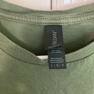 Olive green Gildan t-shirt. Softstyle fabric for comfort.