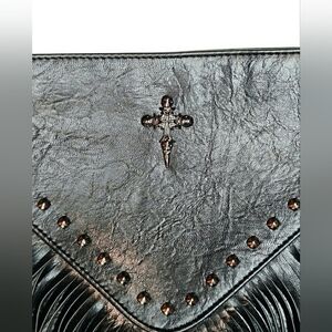 🆕️Goth Faux Black Leather Fringe Pewter Studded Rivet Cross Crossbody Purse