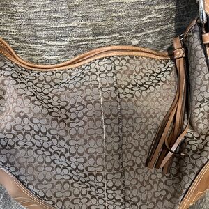 Stylish brown patterned shoulder bag perfect for any occasion. Features a comfortable strap and elegant design. Leather and canvas Preowned used -