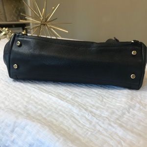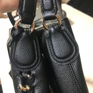 Elegant black shoulder bag. Features gold chain details. Sleek and stylish design. This is the best organized person I’ve ever carried. You’ve got three huge compartments, one on either side and a zippered one in the middle. It really is having to carry.
