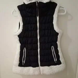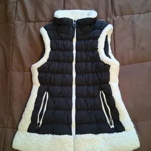 Elegant quilted design with cozy white trim. Ideal for layering in cooler weather. Features front zipper and pockets.