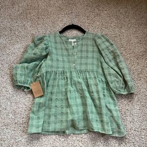 Rude Jude Day blouse in Green Bean wool, kids size 10Y but also fits a women's size XS. I preferred this size to the regular women’s XS cuz that one was a little too oversized for me. New with tags! Note the tag it came with says “100% organic cotton” but this is the wool/linen/cotton/washi blend from the 2023 Holiday collection. I believe RJ makes only one kind of hang tag lol