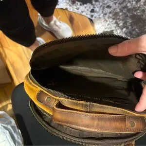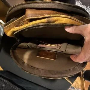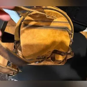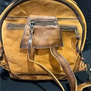 Aztec/leather backpack with tan leather trim. Features a vibrant teal and cream woven design. Perfect for everyday use. Measurements 12x13x3