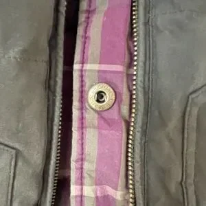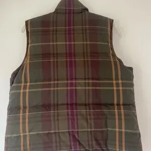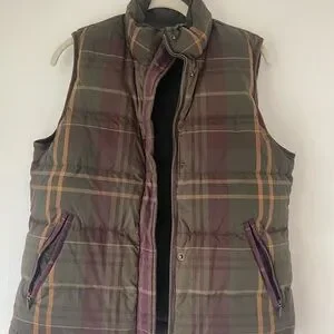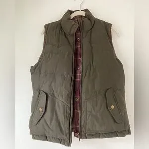Stylish olive vest with quilted design. Features snap and zip closure. Perfect for layering. Reversible!