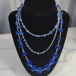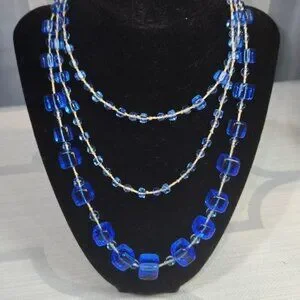 Vintage Czech Blue glass cube beads long flapper necklace from the 1920's