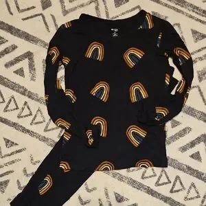 Cozy black pajama set with colorful rainbow print. Perfect for lounging.