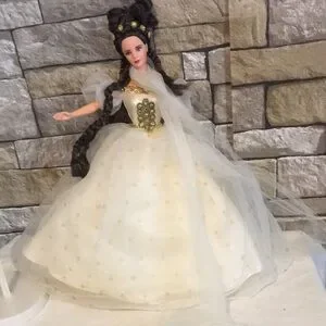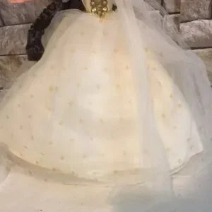 Beautiful doll wearing a white gown with gold accents.