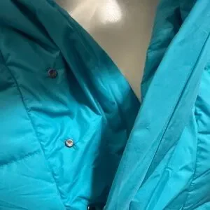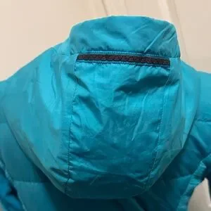 Stay warm in this sleek blue hooded puffer. Perfect for chilly days.