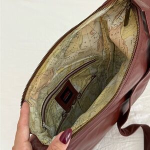 Unique map print interior. Features multiple pockets. Ideal for travel.