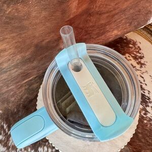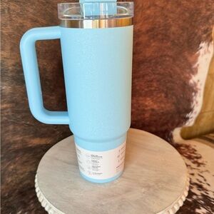 Elegant Stanley tumbler in sky blue. Keeps drinks hot or cold. Perfect for travel and daily use.