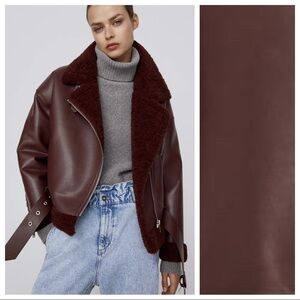NWT. Zara Burgundy Faux Leather Double Faced Aviator Biker Jacket with matching faux fur interior, adjustable buckles at collar, long cuffed sleeves, front welt pockets, belt with metal buckle at hem, front asymmetric zipper closure. Size XS. Ref. 6318/232. Pit to pit 20" flat, shoulders 21", sleeves 20", length 22".