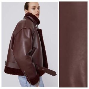 NWT. Zara Burgundy Faux Leather Double Faced Aviator Biker Jacket. Size XS.